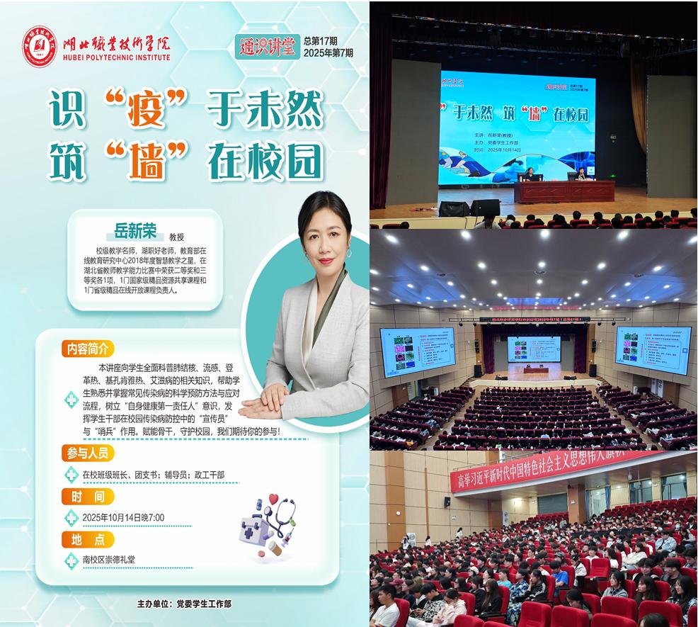 (本网讯 艾孜哈尔·开依沙尔)10月14日晚,学校通识讲堂2025年第7期(总第17期)在南校区崇德礼堂举行。本次讲座以“识‘疫’于未然,筑‘墙’在校园”为主题,特邀校级教学名师、湖职好老师医学院岳新荣教授主讲。党委学生工作部部长魏俊桃主持,全校在校班级班长、团支书、辅导员及政工干部代表参加。