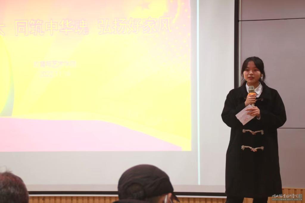 (本网讯 胡晨晨 谭畅 鲁启航)2022年11月16日晚19:00,教育与艺术学院“学习二十大 同筑中华魂 弘扬好家风”主题演讲比赛在师范校区办公楼501会议室举行,校关工委常红生主任、教育与艺术学院院长肖成林出席此次比赛,副院长张玮、副院长陈胜华、学工办赵荣华老师、周小军老师、余翠琴老师、王春老师、李璇老师担任评委。