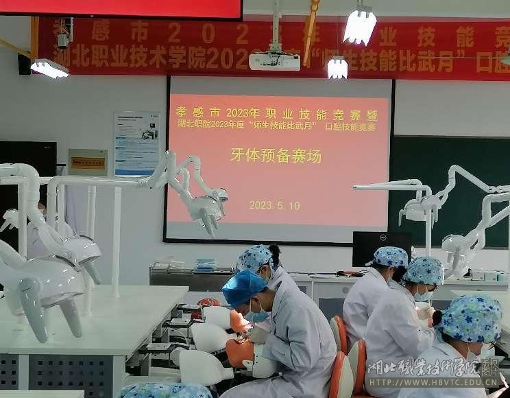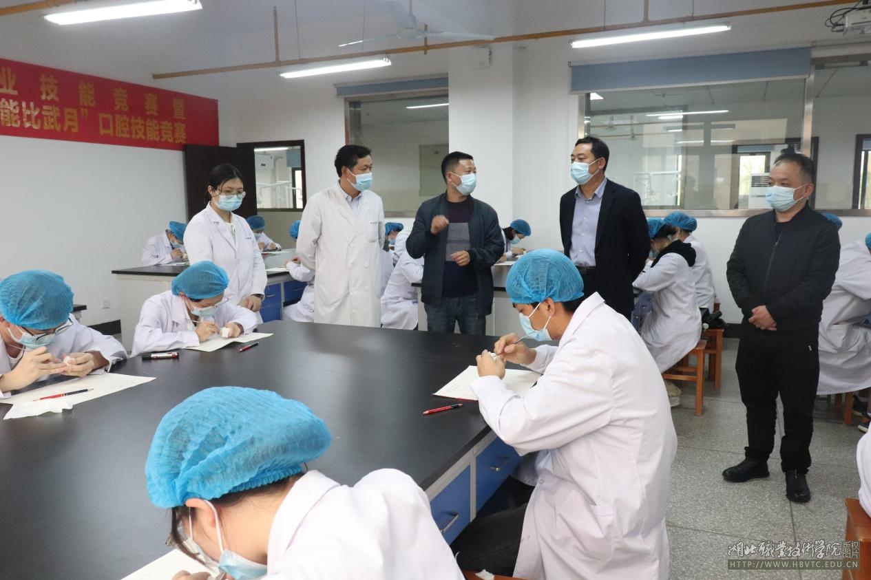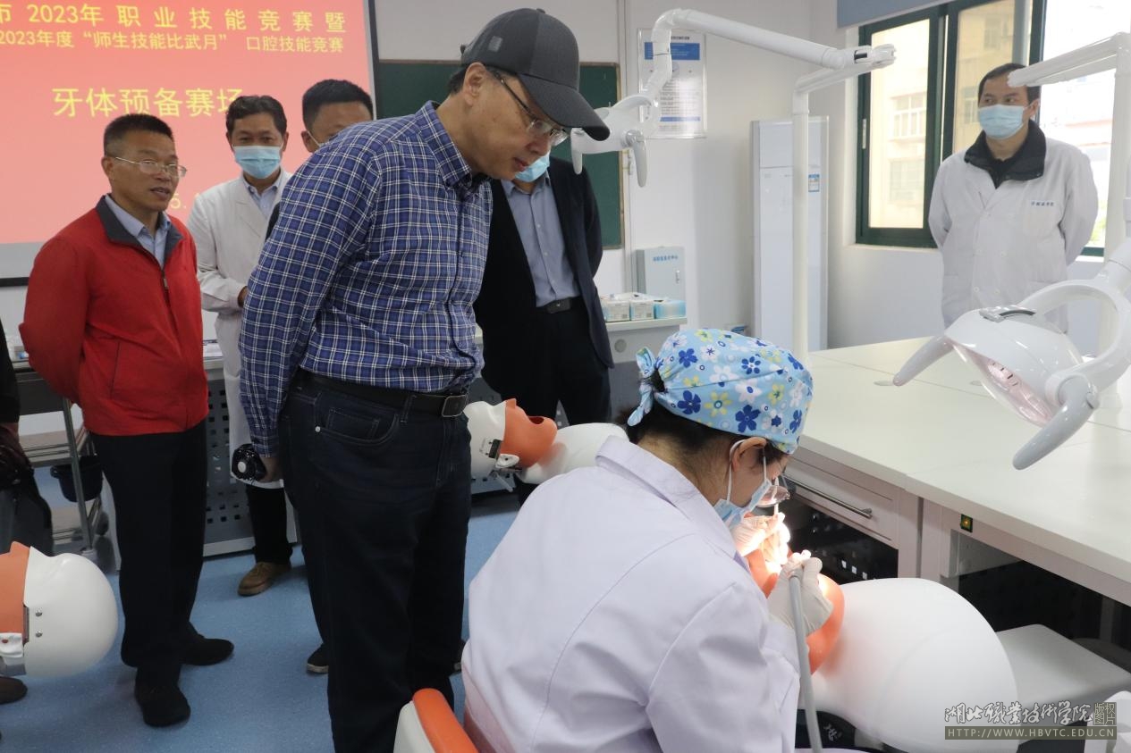(本网讯 通讯员:陈欢 吴逸华)5月10日下午,孝感市2023年职业技能竞赛暨湖北职业技术学院2023年度“师生技能比武月”口腔技能竞赛在仁和楼四楼口腔医学实训中心举行,学校副校长胡昌杰带领教务处处长黄享苟、副处长龚洪浪等一行到口腔医学实训中心指导师生技能比武工作。口腔医学院院长何伟、党总支书记孙国运等参加了相关活动,口腔临床教研室全体专任教师担任此次竞赛赛项评委。