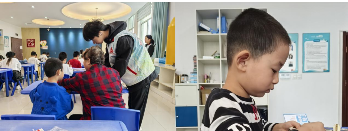 孩子们积极提问、互相分享技巧,遇到困难时,志愿者们耐心引导,鼓励他们大胆尝试。原本略显羞涩的小朋友,在志愿者的陪伴下逐渐放开,主动展示自己的创作思路;动手能力稍弱的孩子,也在志愿者的帮助下完成作品,脸上露出满满的成就感。活动现场充满欢声笑语,一张张稚嫩的脸庞上,写满了对手工创作的热爱与对志愿陪伴的喜爱。